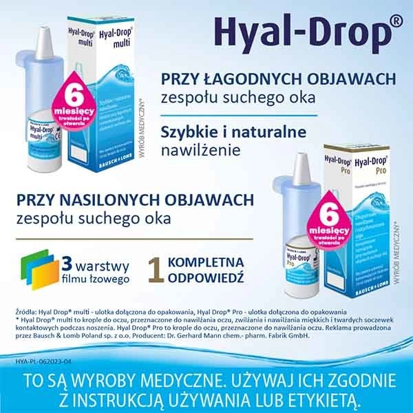 Hyal-Drop multi to wyrób medyczny, służący nie tylko do nawilżania oczu, ale również do nawilżania i zwilżania miękkich i twardych soczewek kontaktowych podczas noszenia.