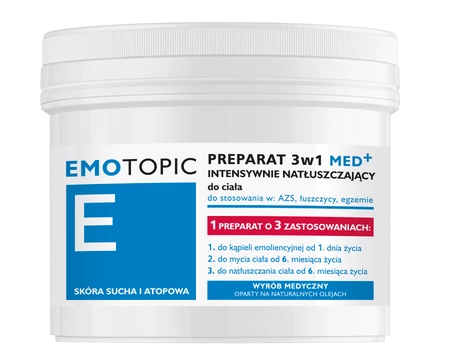 Unikalny na rynku preparat o 3 zastosowaniach (kąpiel, natłuszczanie, mycie ciała) charakteryzuje się skutecznym działaniem łagodzącym oraz wspomagającym leczenie takich chorób jak: AZS, łuszczyca, różne postacie kontaktowych zapaleń skóry. Charakteryzuje się skoncentrowaną zawartością lipidów oraz emolientów, dzięki czemu wzmacnia naturalne funkcje barierowe kojąc i łagodząc uporczywe dolegliwości. Zapewnia skuteczną ochronę przed czynnikami zewnętrznymi i nasileniem się objawów podrażnień skóry. Rekomendowany dla dzieci i dorosłych bez ograniczeń wiekowych.