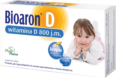 Bioaron D to preparat suplementujący codzienną dietę w witaminę D3, umożliwiający utrzymanie jej prawidłowego poziomu w organizmie. Jest szczególnie polecany w okresie zmniejszonej ekspozycji na światło słoneczne (np. okres jesienno-zimowy, choroby skórne itd.) oraz przy posiłkach ubogich w składniki odżywcze. Witamina D3 uczestniczy w licznych procesach ustrojowych, m.in. warunkuje prawidłową mineralizację kości i zębów, stymuluje odpowiedź immunologiczną, zapewnia właściwe funkcjonowanie mięśni oraz dba o dobre samopoczucie. Porcja 800 j.m. wskazana jest przede wszystkim u małych dzieci i wcześniaków urodzonym przed 32. tygodniem życia.