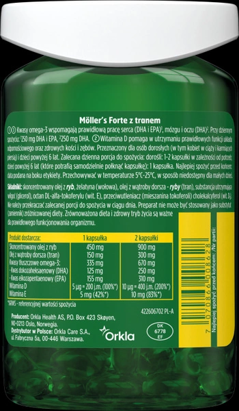 - Möller’s Forte z tranem to skoncentrowane źródło kwasów omega-3 i witaminy D3 zamknięte w miękkich kapsułkach łatwych do połknięcia.