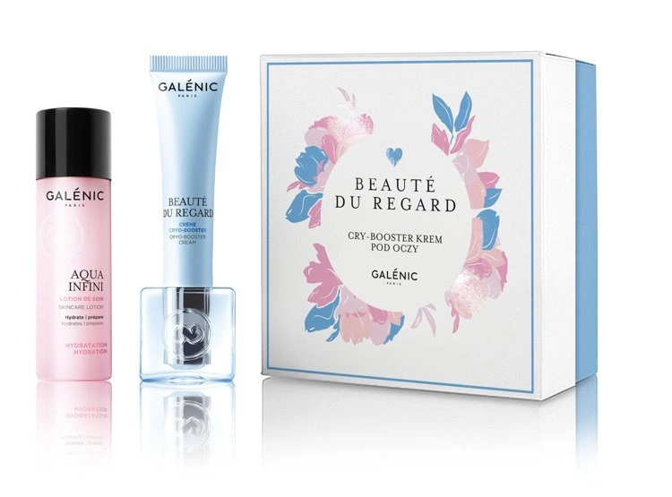 - Zestaw Galenic zawierający dwa kosmetyki: przeciwstarzeniowy krem pod oczy Beaute du Regard oraz pielęgnujący lotion Aqua Infini o właściwościach nawilżających.