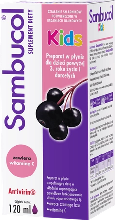 Sambucol Kids opracowano z myślą o wzmacnianiu odporności u dzieci, które ukończyły 3. rok życia. Ekstrakt z owoców bzu czarnego stymuluje aktywność układu immunologicznego oraz wspiera go w walce z drobnoustrojami atakującymi organizm. Oprócz tego, poprzez wpływ napotny i moczopędny, sprzyja eliminacji z organizmu zbędnych metabolitów, toksyn, patogenów i pirogenów (czynników wywołujących gorączkę). Skutecznie łagodzi kaszel i inne objawy infekcji górnych dróg oddechowych. Zawiera także dodatek witaminy C, która także pobudza układ odpornościowy oraz wzmacnia ściany naczyń krwionośnych, czym pośrednio hamuje ekspansję chorobotwórczych mikroorganizmów w głąb ustroju.