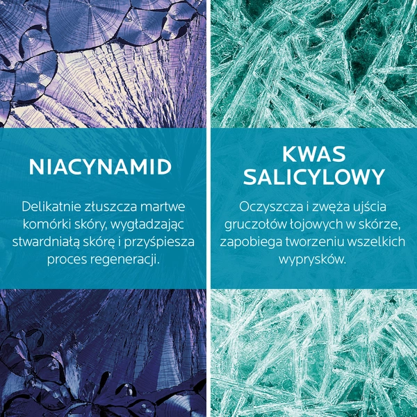 • Skoncentrowane serum z peelingującymi kwasami i kojącą witaminą B3.