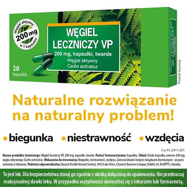 - Węgiel leczniczy VP to produkt leczniczy w postaci kapsułki zawierającej 200 mg węgla aktywnego. Stosowany jest: w leczeniu biegunek, niestrawności i wzdęć oraz w zatruciach lekami i innymi związkami chemicznymi - po porozumieniu z lekarzem.