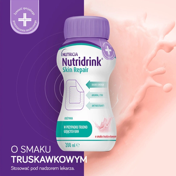 Żywność specjalnego przeznaczenia medycznego. Nutridrink Skin Repair jest produktem wysokobiałkowym, wysokoenergetycznym, zawierającym argininę, cynk i antyoksydanty. Do postępowania dietetycznego w przypadku odleżyn i innych trudno gojących ran*.