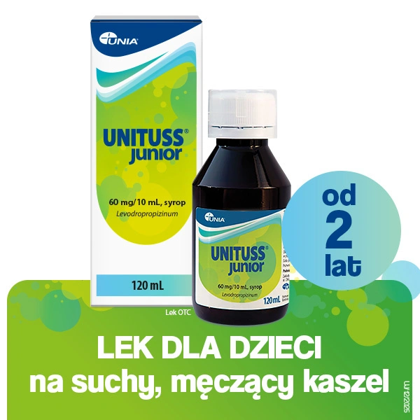 Unituss Junior to syrop przeciwkaszlowy przeznaczony do leczenia suchego, męczącego kaszlu o różnym pochodzeniu, m.in. związanego z infekcjami górnych i dolnych dróg oddechowych lub w przebiegu krztuśca. Substancja czynna – lewodropropizyna – hamuje odruch kaszlu i łagodzi skurcz oskrzeli. Dzięki temu Syrop Unituss zmniejsza częstotliwość i natężenie kaszlu, ułatwiając oddychanie nawet przy napadowym nocnym kaszlu. Unituss Junior mogą stosować dorośli i dzieci od 2 lat, syrop o smaku truskawkowym.