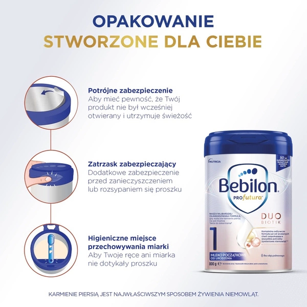 Jeśli dziecko nie jest karmione piersią, Bebilon Profutura Duobiotik 1, tak jak inne mleka początkowe, może stanowić jedyny pokarm zaspokajający wszystkie potrzeby żywieniowe, od czasu wprowadzenia odpowiedniego żywienia uzupełniającego. Także do dokarmiania***.
