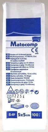 - Działanie: Kompresy z gazy niejałowe Matocomp, wykonane ze 100% gazy bawełnianej, bielonej nadtlenkowo bez użycia chloru, co gwarantuje wysoki poziom czystości chemicznej; brak luźnych włókien na powierzchni kompresu; brzegi zabezpi