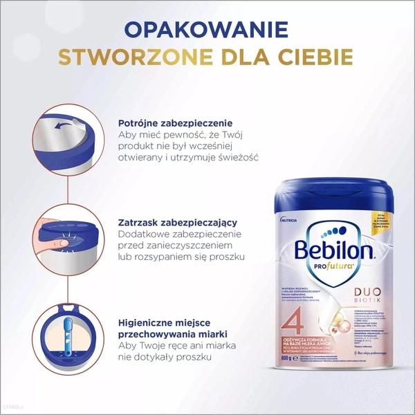 Zaleca się, aby przejście z karmienia produktem Bebilon PROfutura DUOBIOTIK 3 na Bebilon PROfutura DUOBIOTIK 4 przeprowadzać stopniowo, zmniejszając ilość proszku Bebilon PROfutura DUOBIOTIK 3 i zwiększając ilość proszku Bebilon PROfutura DUOBIOTIK 4.