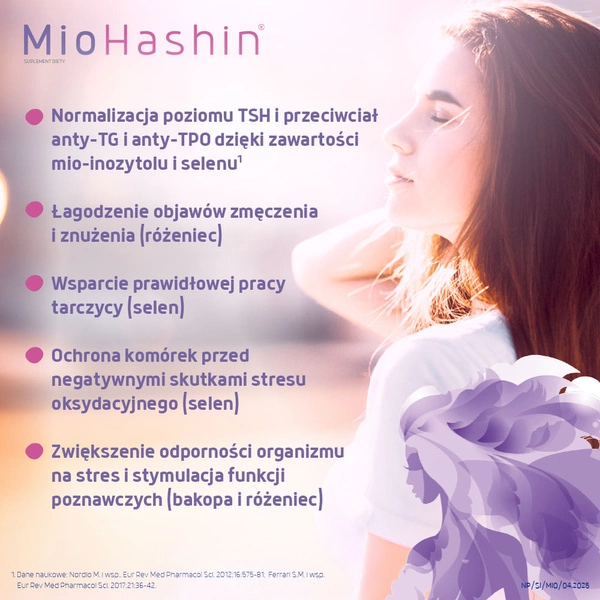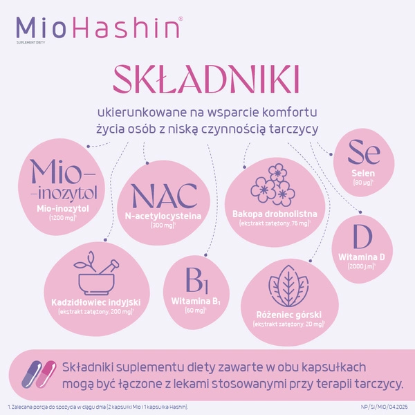 - MioHashin wspiera prawidłową produkcję hormonów przez tarczycę. Zawiera m.in.: mio-inozytol, N-acetyl-L-cysteinę, różeniec górski, selen, witaminy D i B1.
