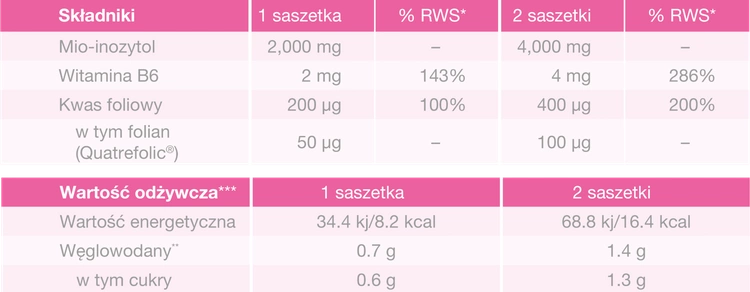 - Pacjentki z PCOS starające się zajść w ciążę: 2 saszetki dziennie. Również w fazie przygotowania lub przy wspomaganiu procesu in vitro.