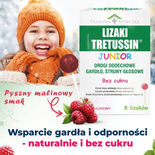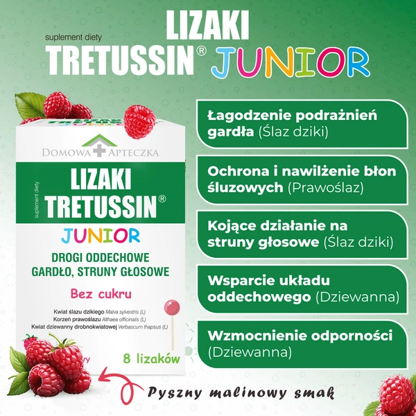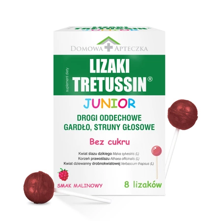 Tretussin Junior Lizaki o smaku malinowym, 8 sztuk DATA WAŻNOŚCI 11.2025r.