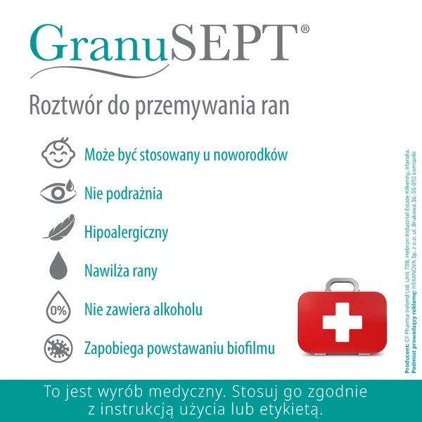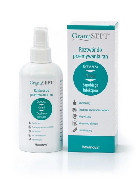 Granusept® jest elektrolizowanym roztworem wody utleniającej oraz kwasu podchlorawego. To wyrób medyczny w postaci roztworu do oczyszczania, przemywania i nawilżania ran. Jest przeznaczony do stosowania w przypadku: otarć skóry, niewielkich skaleczeń, podrażnień, rozcięć, poparzeń. Zapobiega powstawaniu biofilmu.