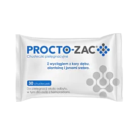 Procto-Zac to specjalistyczne chusteczki nawilżane, przeznaczone do codziennej pielęgnacji i higieny okolic odbytu. Szczególnie polecane są osobom z problemami hemoroidów. Zawierają w swoim składzie wyciąg z kory dębu, alantoinę, pantenol i jony srebra.