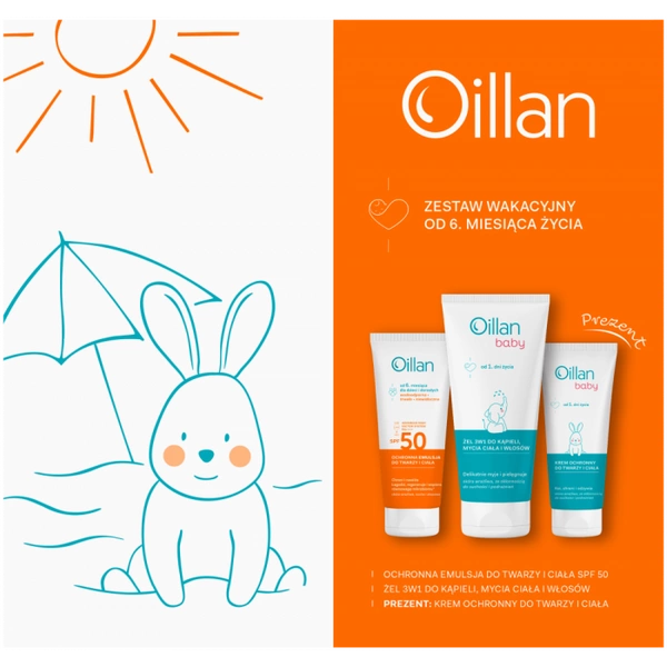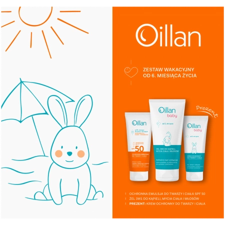Oillan Zestaw Wakacyjny - Ochronna emulsja do twarzy i ciała z filtrem SPF50 100ml 100 ml + Żel 3w1 do mycia 200ml + Krem 75ml
