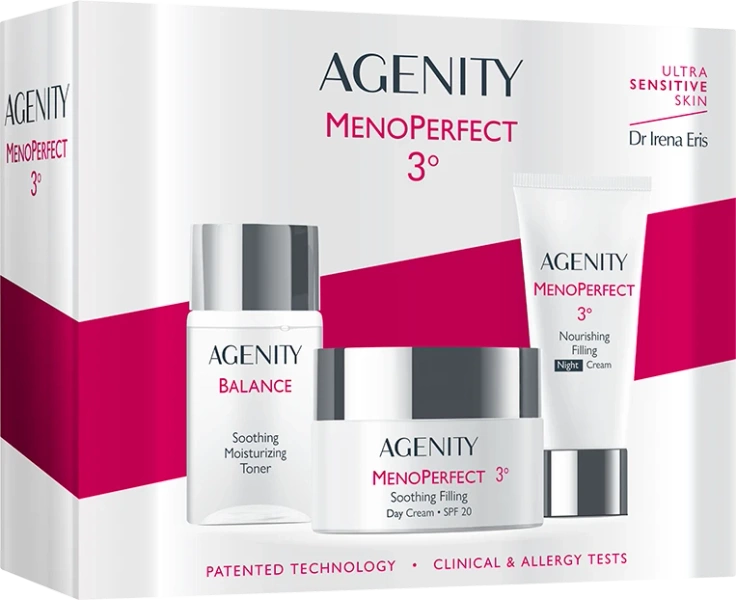 Linia 3° MENOPERFECT zaawansowanej pielęgnacji anti-aging AGENITY stanowi odpowiedź na potrzeby ultrawrażliwej skóry twarzy z widocznymi głębszymi zmarszczkami. Wypełnia linie, zmniejszając ich widoczność, a także poprawia kondycję skóry. Polecana dla kobiet w wieku 45-55 lat, które chcą przywrócić skórze jędrność i sprężystość.