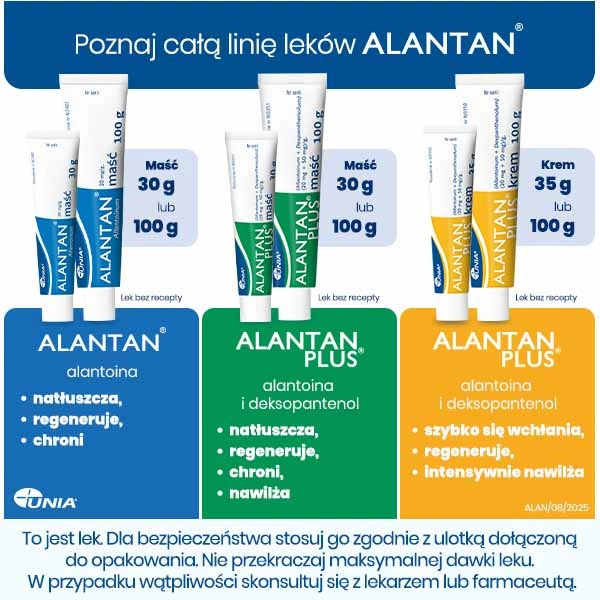 Skuteczność działania leku ALANTAN PLUS® zwiększa zawartość lanoliny - naturalnego emolientu, który tworzy na powierzchni skóry barierę ochronną, zabezpieczającą przed działaniem szkodliwych czynników zewnętrznych. Pomaga utrzymać odpowiednie nawilżenie skóry, natłuszcza i odbudowuje płaszcz hydrolipidowy naskórka.