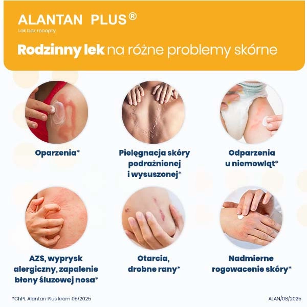 ALANTAN PLUS® krem intensywnie nawilża i regeneruje skórę, a jednocześnie dobrze się wchłania, bez pozostawiania tłustej warstwy. Lek sprawdzi się w przypadku problemów skórnych wymagających szybkiego ukojenia. ALANTAN PLUS® krem może być aplikowany na twarz i błony śluzowe. Nadaje się do stosowania w codziennej pielęgnacji skóry podrażnionej i wysuszonej. Wspomaga leczenie różnego rodzaju ran, tj. otarcia, niewielkie skaleczenia i pęknięcia skóry, oparzeń słonecznych oraz po radioterapii i fototerapii, a także nadmiernego rogowacenia skóry dłoni i stóp. Produkt leczniczy ALANTAN PLUS® krem aplikowany po każdej zmianie pieluszki na oczyszczoną i osuszoną skórę zapobiega odparzeniom u niemowląt. Można po niego sięgać jako uzupełnienie terapii atopowego zapalenia skóry, wyprysku alergicznego, jak również w zapaleniu błony śluzowej nosa oraz w owrzodzeniach podudzi.