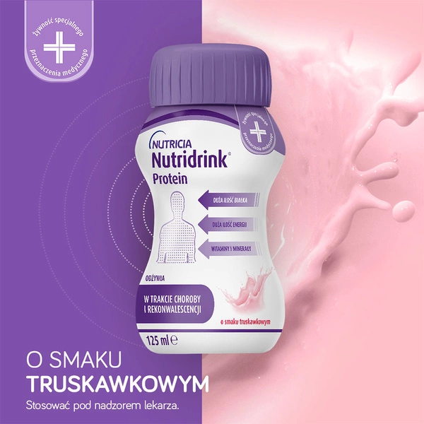 Nutridrink Protein to żywność specjalnego przeznaczenia medycznego. Do postępowania dietetycznego w niedożywieniu i ryzyku niedożywienia związanym z chorobą, szczególnie u pacjentów ze zwiększonym zapotrzebowaniem białkowym. Stosować pod nadzorem lekarza.