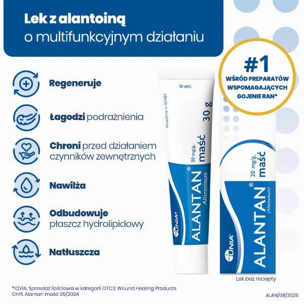 - ALANTAN® to maść z alantoiną na skórę wspomagająca leczenie stanów zapalnych, trudno gojących się ran, oparzeń, owrzodzeń i ubytków skórnych. Działa nawilżająco, łagodząco i regeneracyjnie. Zapewnia skórze ochronę przed czynnikami zewnętrznymi.