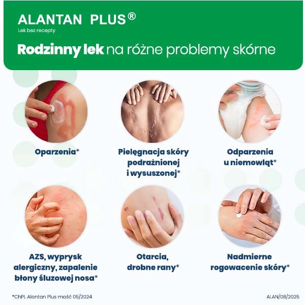 - ALANTAN PLUS® maść to pierwsza pomoc na różne problemy skórne. Działa regeneracyjnie, nawilżająco i ochronnie. Zapobiega odparzeniom, wspomaga leczenie ran, oparzeń, nadmiernego rogowacenia, zapalenia błony śluzowej nosa.