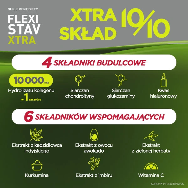 Składniki suplementu na stawy Flexistav Xtra zostały tak dobrane, by wspomagać prawidłowe funkcjonowanie i ruchomość stawów. Z opinii osób stosujących ten preparat wynika, że pozytywne efekty są widoczne po dłuższym i regularnym stosowaniu suplementu Flexistav. Skład o wysokiej zawartości kolagenu, glukozaminy czy chondroityny wspomagają funkcjonowanie kości i chrząstek stawowych, także u osób trenujących, uprawiających różne dziedziny sportu. Może Pan stosować preparat Flexistav Xtra, jednak lepiej robić to regularnie przez dłuższy czas. Producent zaleca, aby stosować go przez przynajmniej 3 miesiące.