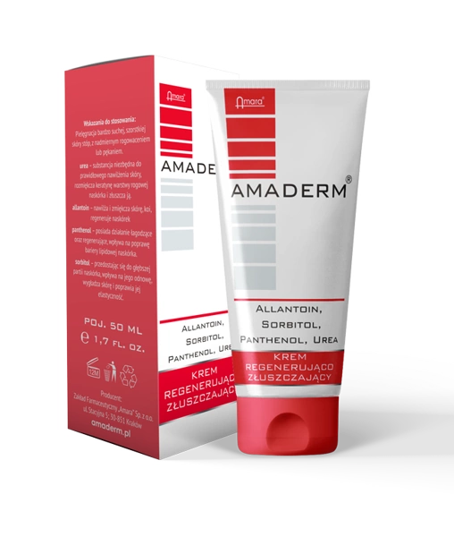 Amaderm Krem regenerująco-złuszczający przeznaczony jest dla osób posiadających bardzo suchą, szorstką skórę stóp, z tendencją do nadmiernego rogowacenia lub pękania.